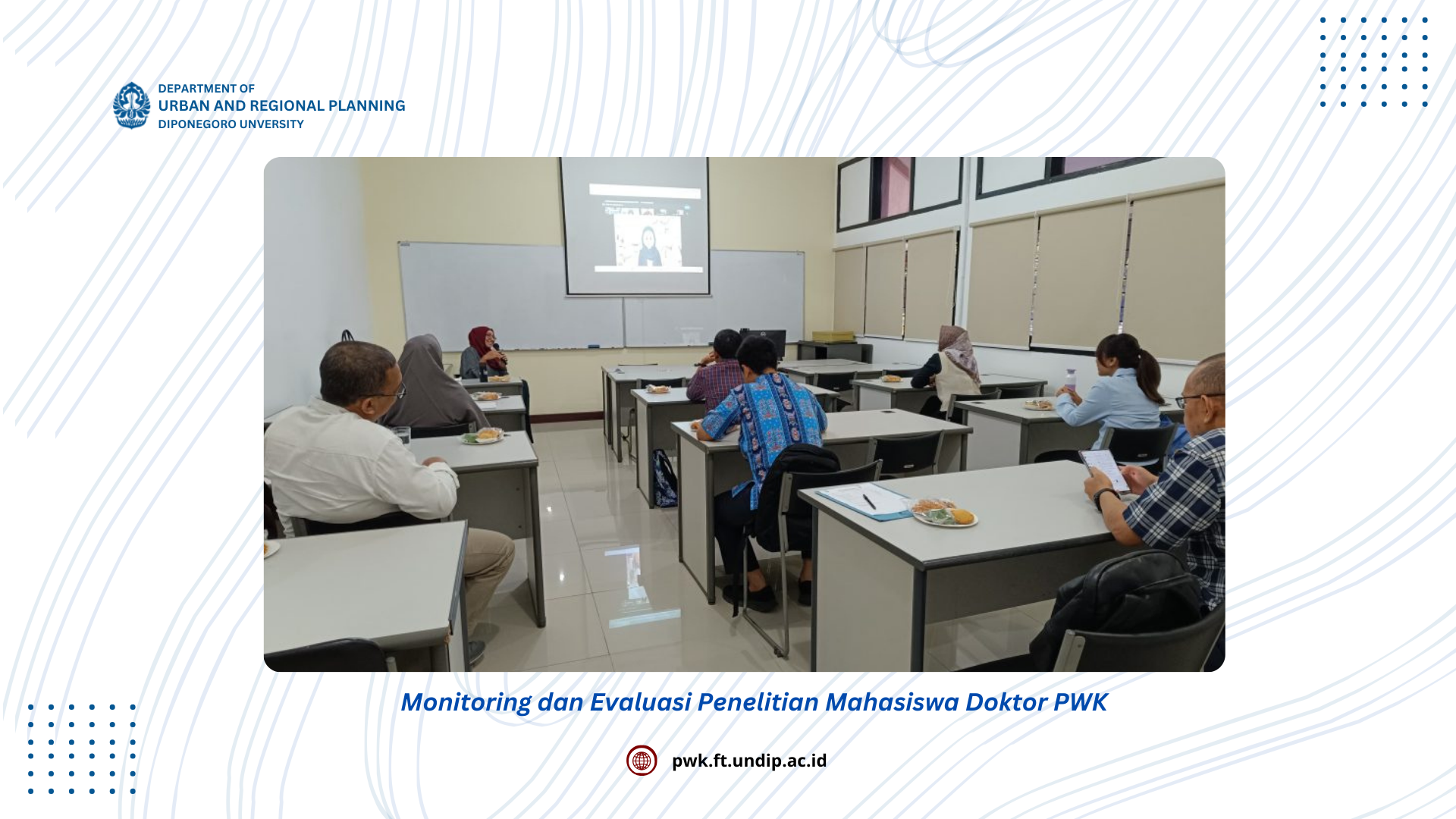 Sebagai upaya program ketepatan dalam meluluskan mahasiswa, yang dilakukan oleh program studi Doktor Perencanaan Wilayah dan Kota Undip yaitu melakukan pemantauan, evaluasi dan pendampingan kepada mahasiswa. Pada tanggal 14 AJgustus 2024, monev dilakukan bagi mahasiswa angkatan I dan angkatan 2 dilaksanakan secara hybrid dimana mereka saat ini sedang memasuki perkuliahan semester 2 dan 3. Pada tahap ini mahasiswa sudah merumuskan lebih detail lagi tentang judul penelitiannya. Monev yang dihadiri oleh pengelola Prof. Wiwandari Handayani selaku ketua program studi S3 PWK, dosen wali angkatan 1 Dr. Jawoto SIh Setyono dan dosen wali angkatan 2 Prof. Iwan Rudiarto dan juga dari Gugus Penjaminan Mutu Departemen PWK