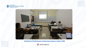 Mahasiswa angkatan kedua program Doktor PWK UNDIP telah melaksanakan sidang pembahasan pra proposal penelitian atas nama Ekannisa Jasmiene Isworo yang dilaksanakan secara luring di kampus
